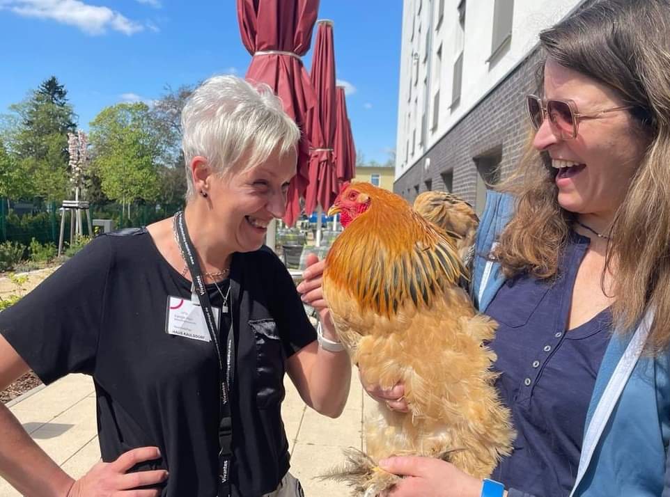 Vivantes Hauptstadtpflege, Berlin - 5. Mai 2023. (Vivantes auf Facebook) Jede Menge tierischer Besuch im Haus Kaulsdorf. Familie Schetz aus Immenstadt war mit ihrem rollenden Streichelzoo bei uns zu Besuch. Den ganzen Tag spazierten Hühner und ein stolzer Hahn, Enten, Gänsefamilien, Kaninchen und ein Hund durch unseren Garten. Mit einigen ausgewählten Tieren überraschten wir einige Bewohner*innen auf den Wohnbereichen und gingen mit ihnen auf Kuschelkurs. Das war vielleicht aufregend, sehr unterhaltsam und schön flauschig. Die Tiere bescherten allen eine sehr schöne und unbeschwerte Zeit.