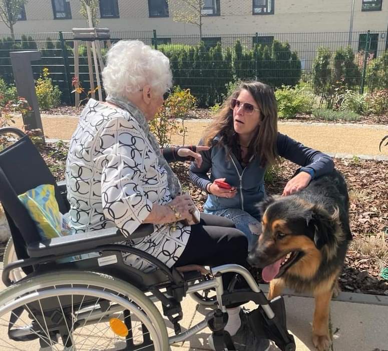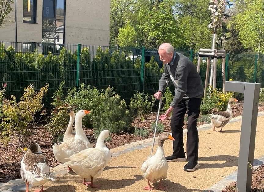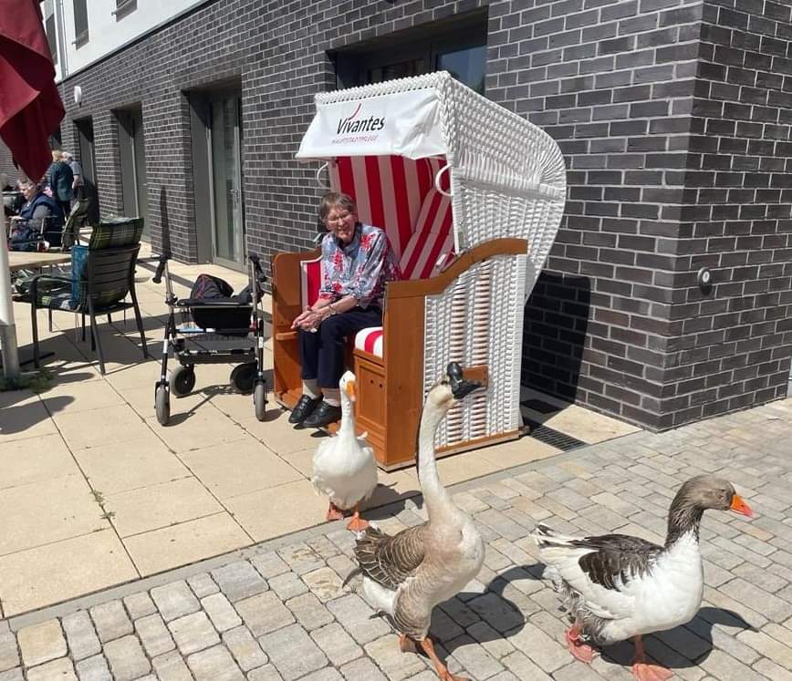 Vivantes Hauptstadtpflege, Berlin - 5. Mai 2023. (Vivantes auf Facebook) Jede Menge tierischer Besuch im Haus Kaulsdorf. Familie Schetz aus Immenstadt war mit ihrem rollenden Streichelzoo bei uns zu Besuch. Den ganzen Tag spazierten Hühner und ein stolzer Hahn, Enten, Gänsefamilien, Kaninchen und ein Hund durch unseren Garten. Mit einigen ausgewählten Tieren überraschten wir einige Bewohner*innen auf den Wohnbereichen und gingen mit ihnen auf Kuschelkurs. Das war vielleicht aufregend, sehr unterhaltsam und schön flauschig. Die Tiere bescherten allen eine sehr schöne und unbeschwerte Zeit.